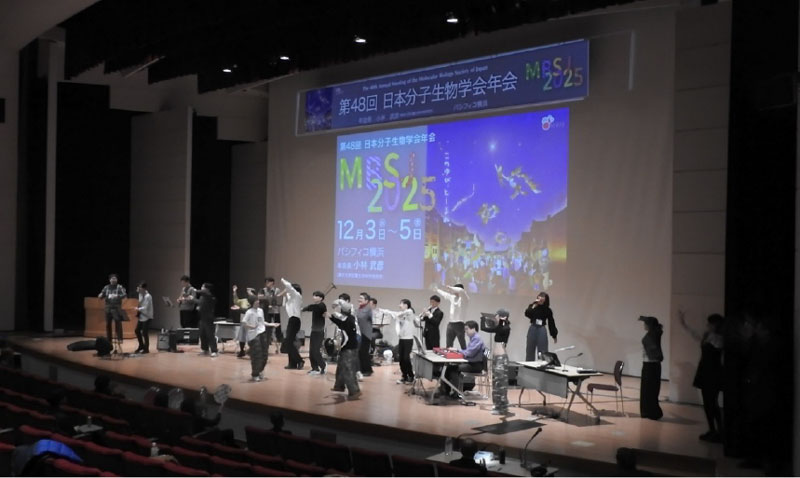 市民公開講座にも多くの高校生、一般の方々に参加していただきました。藤泰子先生、石谷太先生に講演をお願いし、その後のパネルディスカッションではいろいろな質問にもお答えいただきました。研究に関わる職業の魅力が、若い方にもお伝えできたと思います。最後は、胡桃坂バンドとダンサーのパフォーマンスで締めくくりました。パフォーマンスは15分間と短かったのですが、アンコールもあり、大変盛り上がりました。一般公募で集まったダンサーのみなさんも大活躍でした。この場でもまた研究者の新しい側面をお見せできたと思います。