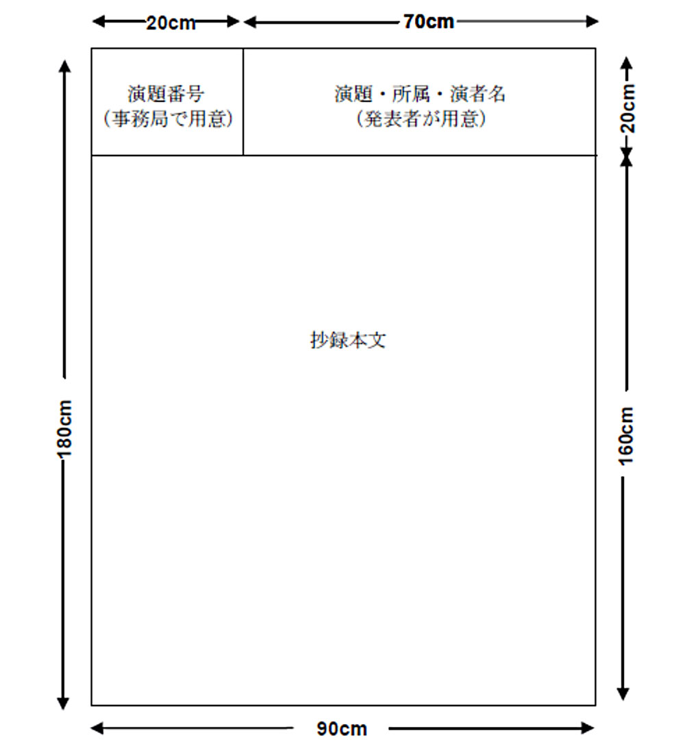 - ・ポスターは右ページの図の作成要項に従って作成してください。パネル左上に演題番号が標示されますので、その右上に演題名・所属・氏名を表記してください。押しピンは事務局にてご用意いたします。